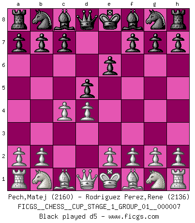 Last move : 1/2-1/2 2025 September 27 0:18:37 [Event "FICGS__CHESS__CUP_STAGE_1_GROUP_01__000007"] [Site "FICGS"] [Date "2025.05.16"] [Round "1"] [White "Pech,Matej"] [Black "Rodriguez Perez,Rene"] [Result "1/2-1/2"] [WhiteElo "2160"] [BlackElo "2136"] 1.c4 e6 2.d4 d5 3.Nc3 Nf6 4.Bg5 Nbd7 5.cxd5 exd5 6.e3 c6 7.Nf3 Be7 8.Bd3 O-O 9.Qc2 h6 10.Bh4 Re8 11.O-O Ne4 12.Bxe7 Qxe7 13.Bxe4 dxe4 14.Nd2 Nf6 15.Rac1 Bf5 16.f4 Rac8 17.Rfe1 b6 18.h3 Nd5 19.Nxd5 cxd5 20.Qb3 Be6 21.Nf1 h5 22.Ng3 g6 23.Qb5 Kg7 24.Ne2 Qh4 25.f5 Bxf5 26.Qxd5 Be6 27.Qe5+ Kh6 28.d5 f6 29.Qf4+ Qxf4 30.Nxf4 Bf7 31.d6 Rxc1 32.Rxc1 Rd8 33.b3 Rxd6 34.Rc7 Bg8 35.Rxa7 h4 36.Kf2 f5 37.Ke1 Kg5 38.Ne2 Rd3 39.Kf2 Rd2 40.Ke1 Rd3 41.Kf2 Rd2 42.Ke1 Rd3 1/2-1/2 Follow this game move after move (download)When you don't know what to do, wait for your opponent to get an idea - it's sure to be wrong. (Tarrasch) Ich glaube, ich kenne inzwischen die Gründe für mein Versagen: schachliche Charakterfehler. Ich war nie ein Wunderkind und in meiner gesamten menschlichen Entwicklung immer zu langsam. (Viktor Kortschnoi) El Ajedrez es imaginación. (David Bronstein) Un millionnaire : 'Monsieur Steinitz ! Vous ne participez aux tournois que pour l'argent, alors que moi je n'y viens que pour l'honneur.' Steinitz : 'Chacun joue pour ce qu'il n'a pas'... The only sure thing about luck is that it will change. (Wilson Mizner)