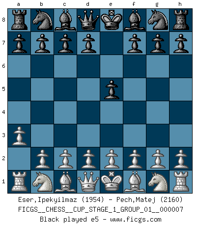 Last move : 0-1 2025 December 7 23:40:13 [Event "FICGS__CHESS__CUP_STAGE_1_GROUP_01__000007"] [Site "FICGS"] [Date "2025.05.16"] [Round "1"] [White "Eser,Ipekyilmaz"] [Black "Pech,Matej"] [Result "0-1"] [WhiteElo "1954"] [BlackElo "2160"] 1.a3 e5 2.a4 d5 3.a5 Nf6 4.g3 a6 5.b3 Be6 6.Bh3 Bxh3 7.Nxh3 Qd7 8.Ng1 Nc6 9.h3 O-O-O 10.Bb2 d4 11.Na3 Qd5 12.Rh2 Bc5 13.Nc4 Kb8 14.e3 h5 15.Nf3 Rhe8 16.Rc1 g5 17.Qe2 g4 18.hxg4 hxg4 19.Nh4 Nb4 20.Qd1 d3 21.c3 Nc6 22.Ra1 Rh8 23.Ba3 Bxa3 24.Rxa3 Rxh4 25.gxh4 Rg8 26.Ra4 g3 27.fxg3 Rxg3 28.Nb6 cxb6 29.Kf2 Rg8 30.Qf3 Qxb3 31.Ra1 Ng4+ 32.Kg3 Nxe3 33.Kf2 Ng4+ 34.Kg3 Nxh2 35.Kxh2 Qc4 36.Kh3 Qe6+ 37.Kh2 e4 38.Qf4+ Qe5 39.Qxe5+ Nxe5 40.Kh1 bxa5 41.Rxa5 Nf3 42.Ra1 Nxd2 43.h5 Nc4 44.h6 Rh8 45.h7 Rxh7+ 46.Kg2 d2 47.Rd1 Ne3+ 48.Kf2 Nxd1+ 49.Ke2 e3 50.c4 Nc3+ 51.Kd3 d1Q+ 52.Kxc3 e2 53.Kb2 e1Q 54.Ka2 Qa4+ 55.Kb2 Rh2+ 0-1 Follow this game move after move (download)Morphy was probably the greatest genius of them all. (Bobby Fischer) Wie gewinnt Tal? Er entwickelt alle seine Figuren in die Brettmitte und opfert sie dann irgendwo. (Robert James Fischer) Tu sabes que vas a perder. Aún cuando tenía la ventaja, yo sabía que iba a perder. - al estar jugando con Fischer (Andrew Soltis) Je menace de comprendre la position. (Anonyme) Perhaps chess is the wrong game for the times (The Chess Master and the Computer, by Garry Kasparov - 2010)