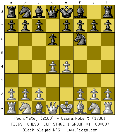 Last move : 0-1 2025 September 4 5:33:8 [Event "FICGS__CHESS__CUP_STAGE_1_GROUP_01__000007"] [Site "FICGS"] [Date "2025.05.16"] [Round "1"] [White "Pech,Matej"] [Black "Csoma,Robert"] [Result "0-1"] [WhiteElo "2160"] [BlackElo "1736"] 1.d4 d6 2.e4 Nf6 3.Nc3 g6 4.Nf3 Bg7 5.Be2 c6 6.O-O Bg4 7.a4 a5 8.Be3 O-O 9.Nd2 e5 10.d5 Bxe2 11.Qxe2 Na6 12.Nc4 cxd5 13.Bb6 Qe7 14.exd5 Nb4 15.Rad1 Na6 16.Nb5 Ne8 17.f4 f5 18.fxe5 dxe5 19.d6 Qe6 20.d7 Nf6 21.Rd6 Qe7 22.Nxe5 Ne4 23.Qc4+ Kh8 24.d8Q Raxd8 25.Rxd8 Bxe5 26.Rxf8+ Qxf8 0-1 Follow this game move after move (download)Pawns are born free, yet they are everywhere in chains. (Rick Kennedy) Kasparov ist eine Art Monster mit hundert Augen, denen auch nicht das Geringste entgeht. (Tony Miles) Botvinnik trataba de restarle el misterio al Ajedrez, siempre relacionandolo a situaciones de la vida ordinaria. El gustaba de llamar al Ajedrez un típico problema inexacto similar a aquellos de los cuales la gente siempre tiene que enfrentarse en la vida cotidiana. (Garry Kasparov) Aucun coup ne doit être joué sans but. (Pedro Damiano) When you stop learning you start dying. (M. Scott Adams)