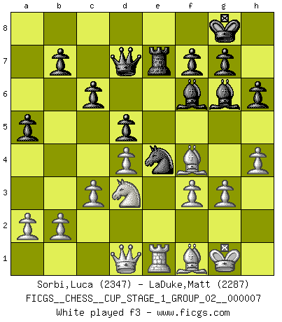 Last move : 1/2-1/2 2025 June 23 14:25:32 [Event "FICGS__CHESS__CUP_STAGE_1_GROUP_02__000007"] [Site "FICGS"] [Date "2025.05.16"] [Round "1"] [White "Sorbi,Luca"] [Black "LaDuke,Matt"] [Result "1/2-1/2"] [WhiteElo "2347"] [BlackElo "2287"] 1.e4 e5 2.Nf3 Nc6 3.Bb5 Nf6 4.O-O Nxe4 5.Re1 Nd6 6.Nxe5 Nxe5 7.Rxe5+ Be7 8.Bf1 O-O 9.d4 Bf6 10.Re1 Re8 11.Bf4 Rxe1 12.Qxe1 Ne8 13.c3 d5 14.Nd2 Bf5 15.Qe2 c6 16.Re1 h6 17.Nb3 Nd6 18.Qf3 Bg6 19.Nc5 Ne4 20.Nd3 a5 21.g3 Qd7 22.h4 Re8 23.Qd1 Re7 24.f3 Nd6 25.Nc5 Qd8 26.Rxe7 Bxe7 27.Qe1 b6 28.Nd3 f6 29.Kf2 Bf7 30.Bc1 g5 31.g4 Qd7 32.Kg2 Kg7 33.Nf2 c5 34.dxc5 bxc5 35.Bd3 Qe6 36.Qe3 a4 37.h5 Qxe3 38.Bxe3 Nc4 39.Bxc4 dxc4 40.Ne4 f5 41.gxf5 Bxh5 42.Bxc5 1/2-1/2 Follow this game move after move (download)The isolated Pawn casts gloom over the entire chessboard. (Aaron Nimzovich) Der Verteidiger gebe der Gewalt nach, aber nur der Gewalt. Er schaffe sich nicht freiwillig, etwa aus Blindheit oder aus Schrecken, irgendwelche Schwächen. Er lasse sich nicht bluffen. (Emanuel Lasker) Observen a Garry Kasparov. Después de una derrota, invariablemente el gana la próxima partida. Prácticamente hace pedazos a su siguiente oponente. Eso es algo que tenemos que aprender a lograr. (Maurice Ashley) Il n'y a pas eu de défaite parce que je ne crois pas que cet ordinateur ait jamais existé. IBM a triché en refusant d'imprimer les modes de recherche de la machine. C'est évident, pendant le match, des coups décisifs ont été joués par des êtres humains. Aujourd'hui, les meilleurs spécialistes en informatique ne peuvent toujours pas expliquer comment Deep-Blue a pu jouer contre la logique des ordinateurs. IBM a gagné une guerre de communication, mais ils sont incapables de prouver que l'ordinateur a gagné tout seul. (Garry Kasparov) I couldn't make any sense out of what this particular thread is about. It sounds like R2 D2 computer speaking. A space fight ?!? Some 'command' problems in Moscow ? Some killers & narcotic addicts attacking some game & a god wannabe ?? (Dinesh De Silva, lost in a russian conflict in FICGS forum)