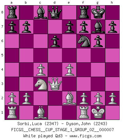 Last move : 1-0 2025 July 7 8:51:8 [Event "FICGS__CHESS__CUP_STAGE_1_GROUP_02__000007"] [Site "FICGS"] [Date "2025.05.16"] [Round "1"] [White "Sorbi,Luca"] [Black "Dyson,John"] [Result "1-0"] [WhiteElo "2347"] [BlackElo "2243"] 1.e4 c5 2.Nf3 g6 3.d4 cxd4 4.Nxd4 Nc6 5.c4 Nf6 6.Nc3 d6 7.Be2 Nxd4 8.Qxd4 Bg7 9.O-O O-O 10.Qd3 Bd7 11.Be3 a6 12.a4 a5 13.Qc2 Bc6 14.Rad1 Nd7 15.Bg4 e6 16.Rxd6 Qh4 17.Be2 1-0 This chess game has been lost on time (started : 2025.05.16 14:30:0) Follow this game move after move (download)Fischer Chess play was always razor-sharp, rational and brilliant. One of the best ever. (Dave Regis) Konzentriere dich auf materielle Gewinne. Nimm, was dir dein Gegner gibt, ausser es gibt einen guten Grund der dagegenspricht. (Robert James Fischer) En posiciones complicadas, Bobby Fischer pocas veces tuvo que temer de cualquiera. (Paul Keres) La guerre est enfant de la passion, la passion est enfant du narcissisme et le narcissisme est l'enfant. (...) Une autre partie ? (Thibault de Vassal) The project of the man are lower than those of the sky. (Chinese proverb)