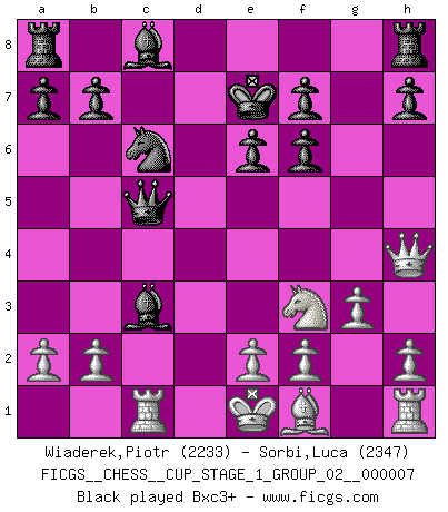 Last move : 1/2-1/2 2025 July 2 21:58:5 [Event "FICGS__CHESS__CUP_STAGE_1_GROUP_02__000007"] [Site "FICGS"] [Date "2025.05.16"] [Round "1"] [White "Wiaderek,Piotr"] [Black "Sorbi,Luca"] [Result "1/2-1/2"] [WhiteElo "2233"] [BlackElo "2347"] 1.d4 Nf6 2.c4 e6 3.Nf3 d5 4.Nc3 Bb4 5.Qb3 c5 6.dxc5 Nc6 7.Bg5 Qa5 8.Bxf6 dxc4 9.Qxc4 gxf6 10.Rc1 Qxc5 11.Qh4 Ke7 12.g3 Bxc3+ 13.bxc3 b6 14.Bg2 Bb7 15.O-O Rac8 16.Rfd1 h5 17.Ne1 Rhd8 18.Nd3 Qa5 19.Nb4 Rxd1+ 20.Rxd1 Qc5 21.Qf4 Na5 22.Qd2 Bxg2 23.Kxg2 Kf8 24.Qh6+ Ke7 25.Qd2 Qxc3 26.Qd6+ Ke8 27.Rd5 Qc7 28.Qxc7 1/2-1/2 Follow this game move after move (download)Chess is a forcing house where the fruits of character can ripen more fully than in life. (Edward Morgan Foster) Du weisst es gibt ein Problem mit Computern und Fernschach, wenn jeder eine Rating von 2450 hat. (John Christen Knudsen) La única cosa que los jugadores de Ajedrez tienen en común, es el Ajedrez. (Lodewijk Prins) Avant la finale, les dieux ont créé le milieu de partie. (Tarrasch) The worth of a book is to be measured by what you can carry away from it. (James Bryce)