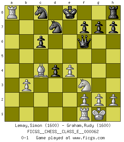 Last move : 0-1 2007 November 9 2:52:28 [Event "FICGS__CHESS__CLASS_E__000062"] [Site "FICGS"] [Date "2007.10.01"] [Round "1"] [White "Lemay,Simon"] [Black "Graham,Rudy"] [Result "0-1"] [WhiteElo "1600"] [BlackElo "1600"] 1.d4 d5 2.c4 dxc4 3.Nf3 e6 4.e4 b5 5.a4 Bb4+ 6.Bd2 Bxd2+ 7.Nbxd2 Bd7 8.Ne5 bxa4 9.Nxd7 Qxd7 10.Bxc4 Qxd4 11.Rxa4 c6 12.b3 Qf6 13.O-O Nd7 14.Nf3 Ne7 15.Qd4 e5 16.Rxa7 exd4 17.Rxa8+ Nc8 0-1 QGA : 3.Nf3 Kingside Castling by player White (move 13) Player Black won this chess game. Follow this game move after move (download)Every Pawn is a potential Queen. (James Mason) Schach ist Kampf, hauptsächlich jedoch gegen die eigenen Fehler. (Savielly Grigorievitsch Tartakower) Sin errores no puede haber brillantez. (Emanuel Lasker) Vouloir jouer aux échecs contre soi-même est aussi paradoxal que vouloir marcher sur son ombre. (Stefan Zweig) Now you put water in a cup, it becomes the cup; You put water into a bottle it becomes the bottle; You put it in a teapot it becomes the teapot. Water can flow or it can crash. Be water, my friend. (Bruce Lee)