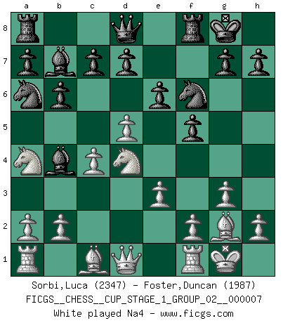 Last move : 1-0 2025 July 19 0:4:57 [Event "FICGS__CHESS__CUP_STAGE_1_GROUP_02__000007"] [Site "FICGS"] [Date "2025.05.16"] [Round "1"] [White "Sorbi,Luca"] [Black "Foster,Duncan"] [Result "1-0"] [WhiteElo "2347"] [BlackElo "1987"] 1.d4 f5 2.g3 Nf6 3.c4 e6 4.Nf3 b6 5.Bg2 Bb7 6.O-O Be7 7.d5 O-O 8.Nc3 Na6 9.Nd4 Bc5 10.e3 Bb4 11.Na4 Bd6 12.dxe6 Bxg2 13.Kxg2 g6 14.exd7 Qxd7 15.b3 Be5 16.Bb2 Bxd4 17.Qxd4 Qxd4 18.exd4 Ne4 19.f3 Ng5 20.Rad1 Nb4 21.Rf2 Rfe8 22.Ba3 a5 23.Nc3 Na6 24.Bc1 Ne6 25.Kf1 Rad8 26.d5 Ng5 27.Bxg5 Rd6 28.Rfd2 Nc5 29.Bf4 Rd7 30.Nb5 1-0 This chess game has been lost on time (started : 2025.05.16 14:30:0) Follow this game move after move (download)Checkers is for tramps. (Paul Morphy) Um sich vor der Gefahr einer Erkältung zu schützen, sorge der wanderlustige König beizeiten für ein brauchbares Versteck. (Aaron Nimzowitsch) El ganador de una partida es aquel jugador que hace el penúltimo error. (Savielly Tartakover) L'ordinateur a tué l'originalité. Il n'y a plus guère d'aventures sur l'échiquier. (Jacob Murray) Secret operations are essential in war; upon them the army relies to make its every move. (Sun Tzu)