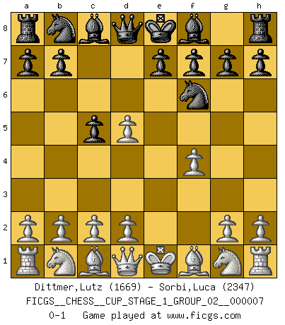 Last move : 0-1 2025 May 23 11:27:26 [Event "FICGS__CHESS__CUP_STAGE_1_GROUP_02__000007"] [Site "FICGS"] [Date "2025.05.16"] [Round "1"] [White "Dittmer,Lutz"] [Black "Sorbi,Luca"] [Result "0-1"] [WhiteElo "1669"] [BlackElo "2347"] 1.e4 c5 2.f4 d5 3.exd5 Nf6 0-1 Follow this game move after move (download)Chess is so inspiring that I do not believe a good player is capable of having an evil thought during the game. (Wilhelm Steinitz) Rubinstein ist ein Turmendspiel, welches die Götter vor tausenden von Jahren begannen. (Savielly Grigorievitsch Tartakower) Haz el enroque temprano y seguido. (Rob Sillars) Ce qui est bien, c'est d'avoir tout un tas de pièces en prise : l'adversaire ne peut en prendre qu'une à la fois. Cité par Thierry Audin. Without deviation from the norm, progress is not possible. (Frank Zappa)