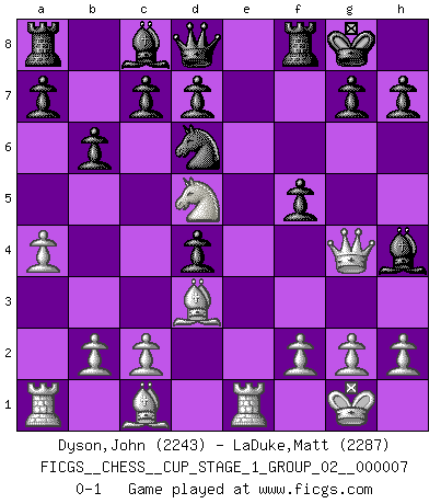 Last move : 0-1 2025 July 10 18:3:59 [Event "FICGS__CHESS__CUP_STAGE_1_GROUP_02__000007"] [Site "FICGS"] [Date "2025.05.16"] [Round "1"] [White "Dyson,John"] [Black "LaDuke,Matt"] [Result "0-1"] [WhiteElo "2243"] [BlackElo "2287"] 1.e4 e5 2.Nf3 Nc6 3.Bb5 Nf6 4.O-O Nxe4 5.Re1 Nd6 6.a4 Be7 7.Nc3 O-O 8.d4 Nxd4 9.Nxd4 exd4 10.Nd5 Bh4 11.Bd3 b6 12.Qg4 f5 0-1 This chess game has been lost on time (started : 2025.05.16 14:30:0) Follow this game move after move (download)Chess is everything: art, science and sport. (Anatoly Karpov) Heutzutage gewinnt im Turnier nicht derjenige Spieler, der weitreichende Pläne entwirft, sondern einfach jener, der Zug um Zug kämpft. (David Bronstein) Si no le temes a Spassky, entonces elimino el elemento del dinero. (Jim Slater) Les échecs, c'est l'art d'analyser. (Mikhail Botvinnik) Memory is a crazy woman that hoards colored rags and throws away food. (Austin O'Malley)