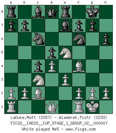 Last move : 1/2-1/2 2025 July 4 14:48:32 [Event "FICGS__CHESS__CUP_STAGE_1_GROUP_02__000007"] [Site "FICGS"] [Date "2025.05.16"] [Round "1"] [White "LaDuke,Matt"] [Black "Wiaderek,Piotr"] [Result "1/2-1/2"] [WhiteElo "2287"] [BlackElo "2233"] 1.d4 d5 2.c4 e6 3.Nc3 Nf6 4.cxd5 exd5 5.Bg5 Be7 6.e3 O-O 7.Bd3 Re8 8.Nf3 h6 9.Bf4 c5 10.O-O c4 11.Bc2 Nc6 12.Ne5 Bd6 13.Nxc6 bxc6 14.Bxd6 Qxd6 15.h3 Rb8 16.Rb1 c5 17.Na4 Nd7 18.Nc3 Rd8 19.Re1 cxd4 20.Qxd4 Ne5 21.Qf4 g5 22.Qh2 Qf6 1/2-1/2 Follow this game move after move (download)Good positions don't win games, good moves do. (Gerald Abrahams) Im Wettkampf zwischen starken Meistern kommen Fehler sehr selten vor, deshalb ist es mit bloßem Warten nicht getan. (José Raúl Capablanca) Un sacrificio se refuta mucho mejor al aceptarlo. (Wilhelm Steinitz) À la honte des hommes, on sait que les lois du jeu sont les seules qui soient partout justes, claires, inviolables et exécutées. Pourquoi l'Indien qui a donné les règles du jeu d'échecs est-il obéi de bon gré dans toute la terre, et que les décrétales des papes, par exemple, sont aujourd'hui un objet d'horreur et de mépris ? C'est que l'inventeur des échecs combina tout avec justesse pour la satisfaction des joueurs, et que les papes, dans leurs décrétales, n'eurent en vue que leur seul avantage. L'Indien voulut exercer également l'esprit des hommes et leur donner du plaisir; les papes ont voulu abrutir l'esprit des hommes. Voltaire (Dictionnaire philosophique / Garnier 1967) Tree pose grows confidence. It roots me to this world. (Terri Guillemets)