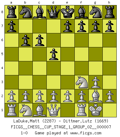 Last move : 1-0 2025 May 23 11:27:41 [Event "FICGS__CHESS__CUP_STAGE_1_GROUP_02__000007"] [Site "FICGS"] [Date "2025.05.16"] [Round "1"] [White "LaDuke,Matt"] [Black "Dittmer,Lutz"] [Result "1-0"] [WhiteElo "2287"] [BlackElo "1669"] 1.g3 d5 2.Nf3 c6 3.Bg2 b6 4.O-O 1-0 Follow this game move after move (download)You are for me the Queen on d8 and I am the Pawn on d7 !! (Eduard Gufeld) Der Knackpunkt bei der Konzentration ist, daß wir nur durch sie etwas Neues und Ungewöhnliches am Schachbrett finden können. Sie ist der einzige Weg durch neue neue Ideen eine Überraschung zu bereiten. (Garry Kasparov) Yo no creo en la psicología. Yo creo en las buenas movidas. (Bobby Fischer) Karpov est une pièce de musée. (Garry Kasparov) Luck never made a man wise. (Seneca, Letters to Lucilius)
