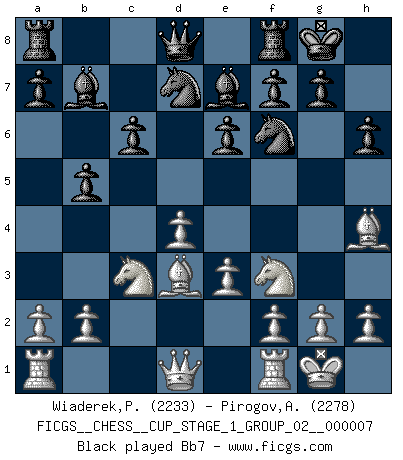 Last move : 1/2-1/2 2025 August 31 8:41:9 [Event "FICGS__CHESS__CUP_STAGE_1_GROUP_02__000007"] [Site "FICGS"] [Date "2025.05.16"] [Round "1"] [White "Wiaderek,Piotr"] [Black "Pirogov,Andrey Mikhaylovich"] [Result "1/2-1/2"] [WhiteElo "2233"] [BlackElo "2278"] 1.d4 Nf6 2.c4 e6 3.Nf3 d5 4.Nc3 c6 5.Bg5 h6 6.Bh4 Nbd7 7.e3 Be7 8.Bd3 dxc4 9.Bxc4 O-O 10.O-O b5 11.Bd3 Bb7 12.Rc1 Rc8 13.a3 a5 14.Ne5 Nxe5 15.dxe5 Nd7 16.Bxe7 Qxe7 17.f4 Nc5 18.Bb1 b4 19.Qc2 g6 20.Nd1 Nd7 21.Nf2 c5 22.Rfd1 c4 23.Rd6 c3 24.axb4 axb4 25.bxc3 Rxc3 26.Qd1 Rxc1 27.Qxc1 Rc8 28.Qd2 Rc7 29.Bc2 Bd5 30.e4 b3 31.Bd1 Bc4 32.Ng4 h5 33.Ne3 Nf8 34.Rd4 Bb5 35.Bxb3 1/2-1/2 Follow this game move after move (download)When I asked Fischer why he had not played a certain move in our game, he replied: 'Well, you laughed when I wrote it down !' (Mikhail Tal) Alles was ich jemals tun will ist Schach spielen. (Robert James Fischer) No existe un remordimiento como el remordimiento del Ajedrez. (H. G. Wells) La menace est plus forte que l'exécution. (Aaron Nimzovitch) The hypothalamus is one of the most important parts of the brain, involved in many kinds of motivation, among other functions. The hypothalamus controls the 'Four Fs: Fighting, Fleeing, Feeding and Mating. (Unknown author)