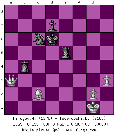 Last move : 1/2-1/2 2025 August 7 15:46:22 [Event "FICGS__CHESS__CUP_STAGE_1_GROUP_02__000007"] [Site "FICGS"] [Date "2025.05.16"] [Round "1"] [White "Pirogov,Andrey Mikhaylovich"] [Black "Teverovski,Bogoljub"] [Result "1/2-1/2"] [WhiteElo "2278"] [BlackElo "2169"] 1.d4 Nf6 2.c4 e6 3.Nc3 Bb4 4.e3 c5 5.Nge2 cxd4 6.exd4 O-O 7.a3 Be7 8.d5 exd5 9.cxd5 Bc5 10.b4 Bd6 11.Nb5 Be5 12.Ra2 a6 13.f4 Bxf4 14.Nxf4 axb5 15.d6 Ne4 16.Re2 Nc3 17.Qd3 Nxe2 18.Bxe2 Ra6 19.O-O Qb6+ 20.Rf2 Qxd6 21.Nd5 Qe6 22.Bb2 f6 23.Bd1 Rd6 24.Bc2 Rxd5 25.Qxh7+ Kf7 26.Rxf6+ Qxf6 27.Bxf6 Kxf6 28.Qg6+ Ke7 29.Qxg7+ Rf7 30.Qg8 Re5 31.h3 Nc6 32.Qxc8 Rf8 33.Qxb7 Rb8 34.Qa6 Kd6 35.a4 bxa4 36.Qxa4 Rxb4 37.Qa3 Kc7 38.Qg3 Kb7 39.Bg6 Ra5 40.Qe1 Kc7 41.Kh2 Rg5 42.Bc2 Rc5 43.Bd3 Kd8 44.h4 Rd5 45.Bc2 Rc5 46.Bg6 Rcb5 47.Qf2 Ne5 48.Bf5 Ng4+ 49.Bxg4 Rxg4 50.Kh3 Rgb4 1/2-1/2 Follow this game move after move (download)One of these modest little moves may be more embarrassing to your opponent than the biggest threat. (Siegbert Tarrasch) Alle offensichtlichen Züge sehen nach dem Spiel in der Analyse verdächtig aus. (Viktor Kortschnoi) Existen dos clases de sacrificios: los correctos y los míos. (Mikhail Tal) A ce moment-là, je menaçais de comprendre la position ! (Clément L'Heureux) Experiences are the keys to life. (Daniel Parmet)