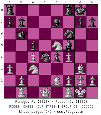 Last move : 1-0 2025 July 19 13:1:12 [Event "FICGS__CHESS__CUP_STAGE_1_GROUP_02__000007"] [Site "FICGS"] [Date "2025.05.16"] [Round "1"] [White "Pirogov,Andrey Mikhaylovich"] [Black "Foster,Duncan"] [Result "1-0"] [WhiteElo "2278"] [BlackElo "1987"] 1.d4 f5 2.c4 Nf6 3.Nc3 e6 4.a3 Be7 5.Bf4 O-O 6.e3 d6 7.Bg3 c5 8.dxc5 dxc5 9.Qc2 Nc6 10.Be2 e5 11.Nf3 f4 12.exf4 Nd4 13.Qd1 e4 14.Ne5 Qb6 15.Rb1 Bf5 16.O-O Rad8 17.Qe1 Bd6 18.b3 1-0 Follow this game move after move (download)Not only will I predict his triumph over Botvinnik, but I'll go further and say that he'll probably be the greatest Chess player that ever lived. (John Collins) Der beste Spieler in einem Turnier gewinnt es nie. Er landet auf Platz zwei oder drei. (Siegbert Tarrasch) Una mala movida nulifica cuarenta buenas. (Horowitz) Même si vous avez un bon coup à faire, regardez toujours s'il n'y en a pas un qui lui soit préférable. (Pedro Damiano) Pushing plastic is for the many, pushing virtual pieces is for the fewer, pushing wood is for the very few. (Normajean Yates)