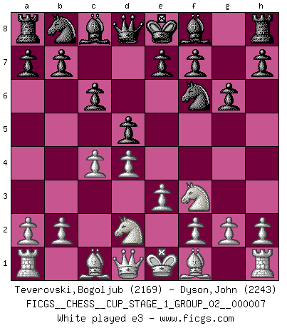 Last move : 1-0 2025 July 8 12:54:47 [Event "FICGS__CHESS__CUP_STAGE_1_GROUP_02__000007"] [Site "FICGS"] [Date "2025.05.16"] [Round "1"] [White "Teverovski,Bogoljub"] [Black "Dyson,John"] [Result "1-0"] [WhiteElo "2169"] [BlackElo "2243"] 1.d4 d5 2.c4 c6 3.Nf3 Nf6 4.Nbd2 g6 5.e3 Bf5 6.Be2 e6 7.O-O Nbd7 8.b3 h5 9.Bb2 Bd6 10.Ne5 Ng4 11.Ndf3 f6 12.Nd3 Qc7 13.h3 Be4 14.Nd2 Bh2+ 15.Kh1 f5 16.Nf3 1-0 This chess game has been lost on time (started : 2025.05.16 14:30:0) Follow this game move after move (download)If your opponent cannot do anything active, then don't rush the position; instead you should let him sit there, suffer, and beg you for a draw. (Jeremy Silman) Ich war zu klein für die Schach-Schülermannschaft! (Woody Allen) El Ajedrez es el juego mas altamente simbólico, pero las agresiones estan por lo tanto aún mas francamente representadas en la partida. Tal vez comenzo como un juego de guerra; Algo como la representación de una batalla en miniatura entre las fuerzas de dos reinos. (Karl Meninger) La guerre est enfant de la passion, la passion est enfant du narcissisme et le narcissisme est l'enfant. (...) Une autre partie ? (Thibault de Vassal) Employ the attack like tactic of defense. (Chinese proverb)