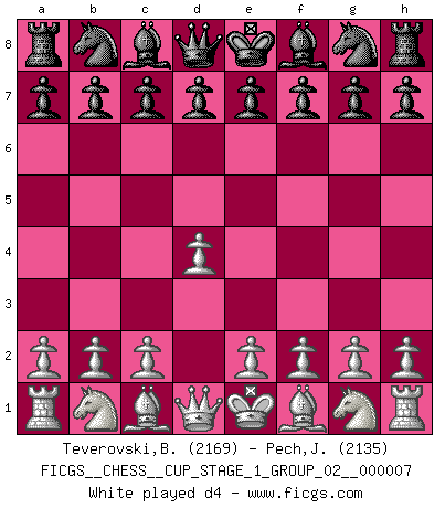 Last move : 1-0 2025 August 6 2:18:43 [Event "FICGS__CHESS__CUP_STAGE_1_GROUP_02__000007"] [Site "FICGS"] [Date "2025.05.16"] [Round "1"] [White "Teverovski,Bogoljub"] [Black "Pech,Jaroslav senior"] [Result "1-0"] [WhiteElo "2169"] [BlackElo "2135"] 1.d4 d5 2.c4 e6 3.Nf3 Nf6 4.g3 Bb4+ 5.Bd2 Be7 6.Bg2 O-O 7.O-O c6 8.Qc2 Nbd7 9.Rc1 a5 10.Bf4 Nh5 11.Be3 Nhf6 12.a4 Bd6 13.Nbd2 Re8 14.Bf4 Bxf4 15.gxf4 b6 16.cxd5 cxd5 17.e3 Qe7 18.Qb3 Ba6 19.Qa3 Qxa3 20.Rxa3 1-0 Follow this game move after move (download)On the chessboard, lies and hypocrisy do not survive long. (Emanuel Lasker) Wer mein Gambit spielt, muß bereit sein, alle Brücken hinter sich abzubrechen. Es verändert den ganzen Menschen. Es wirkt wie ein Zauberstab und fördert verkümmerte, gute Charakter- eigenschaften wieder zu Tage. (Emil Joseph Diemer) Cualquier cambio de material en una posición debe venir por medio de un mate, una captura o promoción de Peón. (Purdy) Toute estimation doit être constamment réévaluée. (Jacob Estrin) All the troubles of the world come from being unable to sit alone in a quiet room. (Blaise Pascal)