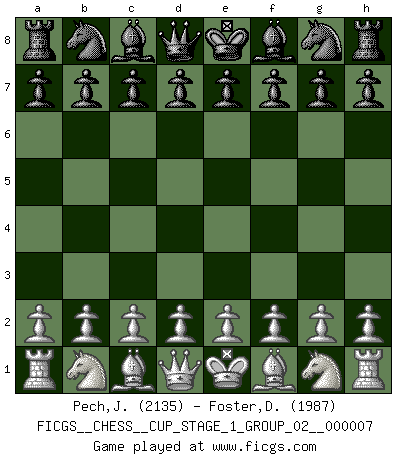 Last move : 1-0 2025 August 6 12:12:22 [Event "FICGS__CHESS__CUP_STAGE_1_GROUP_02__000007"] [Site "FICGS"] [Date "2025.05.16"] [Round "1"] [White "Pech,Jaroslav senior"] [Black "Foster,Duncan"] [Result "1-0"] [WhiteElo "2135"] [BlackElo "1987"] 1.e4 c5 2.Nf3 d6 3.d4 cxd4 4.Nxd4 Nf6 5.Nc3 a6 6.Be3 e5 7.Nb3 Be7 8.f3 O-O 9.Qd2 1-0 This chess game has been lost on time (started : 2025.05.16 14:30:0) Follow this game move after move (download)Look at Garry Kasparov. After he loses, invariably he wins the next game. He just kills the next guy. That's something that we have to learn to be able to do. (Maurice Ashley) Ich könnte leicht behaupten: Ja,ja, Leonid Breschnew wollte nicht, daß ich Weltmeister werde. In der Tat war die Sache komplizierter. (Viktor Kortschnoi) Diferente gente reacciona diferentemente en aceptar la derrota. (Bobby Fischer) Horreur, mais aussi harmonie suprême : qu'y avait-il en effet au monde en dehors des échecs ? Le brouillard, l'inconnu, le non-être... (Vladimir Nabokov) Waiting for chance ? Play in casinos. (FICGS proverb)
