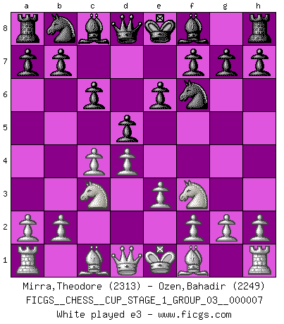 Last move : 1/2-1/2 2025 August 3 18:30:7 [Event "FICGS__CHESS__CUP_STAGE_1_GROUP_03__000007"] [Site "FICGS"] [Date "2025.05.16"] [Round "1"] [White "Mirra,Theodore"] [Black "Ozen,Bahadir"] [Result "1/2-1/2"] [WhiteElo "2313"] [BlackElo "2249"] 1.Nf3 d5 2.d4 Nf6 3.c4 e6 4.Nc3 c6 5.e3 Nbd7 6.Be2 Bd6 7.O-O O-O 8.b3 b6 9.Bb2 Bb7 10.Qc2 Qe7 11.Rad1 Rfe8 12.Rfe1 Rad8 13.Bf1 c5 14.cxd5 exd5 15.dxc5 bxc5 16.Ne2 Bc7 17.Ng3 Ba5 18.Bc3 Bxc3 19.Qxc3 Qd6 20.a3 g6 21.b4 Rc8 22.Bb5 Bc6 23.Ba6 cxb4 24.Qxb4 Qxb4 25.axb4 Rb8 26.Rb1 Bb5 27.Bxb5 Rxb5 28.Nd4 Rb6 29.Nge2 Reb8 30.Ra1 a6 31.Nf4 Ne5 32.h4 Rxb4 33.Rxa6 Kg7 34.f3 Rb1 35.Rxb1 Rxb1+ 36.Kf2 Rb2+ 37.Kg3 Nc4 38.Ra7 Kf8 39.Ra6 1/2-1/2 Follow this game move after move (download)The passion for playing Chess is one of the most unaccountable in the world. (H.G. Wells) Vielleicht wirkt die Aura früherer Spieler glanzvoller als die der heutigen Spieler, aber das liegt daran, dass man kein Programm wie Fritz hatte, das einem all die Löcher in ihren Partien zeigt. (Vladimir Kramnik) El Ajedrez es despiadado: debes de estar preparado para matar gente. (Nigel Short) Mais n'est-ce pas déjà le limiter injurieusement que d'appeler les échecs un jeu? N'est-ce pas aussi une science, un art, ou quelque chose qui, comme le cercueil de Mahomet entre ciel et terre, est suspendu entre l'un et l'autre, et qui réunit un nombre incroyable de contraires ? (Stefan Zweig) Computers have lots of memory but no imagination. (Anonymous)