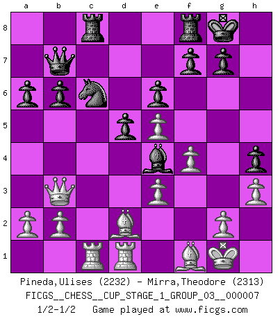 Last move : 1/2-1/2 2025 May 21 14:0:51 [Event "FICGS__CHESS__CUP_STAGE_1_GROUP_03__000007"] [Site "FICGS"] [Date "2025.05.16"] [Round "1"] [White "Pineda,Ulises"] [Black "Mirra,Theodore"] [Result "1/2-1/2"] [WhiteElo "2232"] [BlackElo "2313"] 1.d4 d5 2.c4 c6 3.e3 Bf5 4.cxd5 cxd5 5.Qb3 Qd7 6.Nf3 Nc6 7.Ne5 Nxe5 8.dxe5 a6 9.Nc3 e6 10.Bd2 Ne7 11.Na4 Qc7 12.Rc1 Nc6 13.Be2 Be7 14.Qb6 Rc8 15.O-O h5 16.Qb3 O-O 17.Nc5 Bxc5 18.Rxc5 h4 19.h3 Qb8 20.f4 b6 21.R5c1 Qb7 22.Rfd1 Be4 23.Bf1 1/2-1/2 Follow this game move after move (download)You can only get good at Chess if you love the game. (Bobby Fischer) Die Leute spielen gegen mich seit 15 Jahren unter Ihren Möglichkeiten. (Robert James Fischer) Si no le temes a Spassky, entonces elimino el elemento del dinero. (Jim Slater) Même si vous avez un bon coup à faire, regardez toujours s'il n'y en a pas un qui lui soit préférable. (Pedro Damiano) He who laughs last probably does not get the joke. (Unknown)