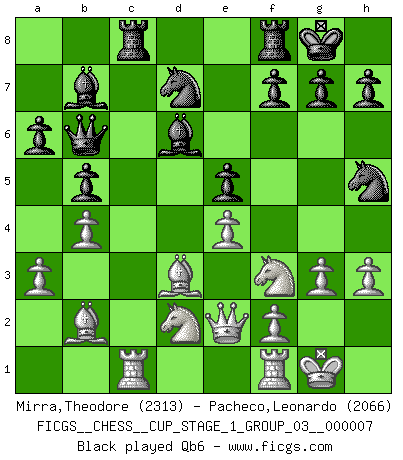 Last move : 1/2-1/2 2025 July 25 13:17:22 [Event "FICGS__CHESS__CUP_STAGE_1_GROUP_03__000007"] [Site "FICGS"] [Date "2025.05.16"] [Round "1"] [White "Mirra,Theodore"] [Black "Pacheco,Leonardo"] [Result "1/2-1/2"] [WhiteElo "2313"] [BlackElo "2066"] 1.Nf3 d5 2.d4 Nf6 3.c4 dxc4 4.e3 c5 5.Bxc4 e6 6.O-O a6 7.b3 Nbd7 8.Bb2 Be7 9.dxc5 Bxc5 10.Bd3 b6 11.Nbd2 Bb7 12.Qe2 O-O 13.a3 b5 14.b4 Bd6 15.h3 Rc8 16.e4 Nh5 17.g3 e5 18.Rac1 Qb6 19.Kh2 Rxc1 20.Bxc1 Rc8 21.Nb3 Nhf6 22.Nh4 g6 23.Na5 Ba8 24.Bb1 Qb8 25.f3 Nf8 26.Ba2 Qc7 27.Ng2 Qe7 28.Bb2 Ne6 29.Qe3 Rc2 30.Rf2 Rxf2 31.Qxf2 h5 32.Bc1 Nd4 33.Nb3 Qc7 34.Bb2 Ne6 35.Qd2 Nd7 36.Ne1 Nb6 37.Na5 Nd4 38.Kg2 Kh7 39.g4 hxg4 40.hxg4 Na4 41.Ba1 Kg7 42.Nb3 Ne6 43.Nc1 Qe7 44.Ncd3 Ng5 45.Nf2 f6 46.Nh3 Nf7 47.Nd3 Nb6 48.Qc3 f5 49.exf5 gxf5 50.gxf5 Qh4 51.Ndf2 Ng5 52.Nxg5 Qxg5+ 53.Kf1 Qxf5 54.Qe3 Bxf3 55.Qxb6 Qg5 56.Bc3 Qc1+ 57.Be1 Qg5 1/2-1/2 Follow this game move after move (download)Chess, like any creative activity, can exist only through the combined efforts of those who have creative talent, and those who have the ability to organize their creative work. (Mikhail Botvinnik) Wir irren allesamt, nur jeder irrt anders. (Georg Christoph Lichtenberg) Al jugar al Ajedrez entonces, podemos aprender: Primero: Previsión... Segundo: Prudencia... Tercero: Cautela... Y al final, aprendemos del Ajedrez el hábito de no ser desanimados por apariencias malas presentes en el estado de nuestros asuntos, el hábito de la esperanza por una oportunidad favorable y la perseveración de los secretos de los recursos. (Benjamin Franklin) La guerre est enfant de la passion, la passion est enfant du narcissisme et le narcissisme est l'enfant. (...) Une autre partie ? (Thibault de Vassal) Perception is reality. (Immanuel Kant)