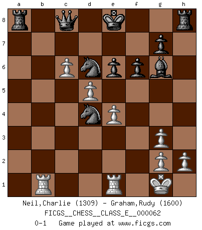 Last move : 0-1 2008 January 11 17:46:29 [Event "FICGS__CHESS__CLASS_E__000062"] [Site "FICGS"] [Date "2007.10.01"] [Round "1"] [White "Neil,Charlie"] [Black "Graham,Rudy"] [Result "0-1"] [WhiteElo "1309"] [BlackElo "1600"] 1.d4 d5 2.c4 dxc4 3.Nc3 a6 4.a4 c6 5.e3 Bf5 6.Bxc4 e6 7.e4 Bg6 8.Nge2 Bb4 9.Ng3 h5 10.O-O Bxc3 11.bxc3 h4 12.Re1 hxg3 13.fxg3 Ne7 14.Bf4 Nd7 15.Qb3 Qc8 16.Rab1 b5 17.axb5 axb5 18.Bf1 Nb6 19.Bxb5 cxb5 20.Qxb5+ Nd7 21.c4 f6 22.Bd6 Nc6 23.d5 Nd4 24.Qb6 Nxb6 25.c5 Nc4 26.c6 Nxd6 0-1 Queen's gambit accepted Kingside Castling by player White (move 10) Player Black won this chess game. Follow this game move after move (download)The way he plays Chess demonstrates a man's whole nature. (Stanley Ellin) Ich verachte die Medien. (Robert James Fischer) Yo adoro todas la posiciones. Denme una partida posicional difícil, y la jugaré. Pero posiciones totalmente ganadas, no las tolero. (Hein Donner) Vous savez, camarade Pachman, je n'éprouve pas de plaisir à être ministre, je jouerais plutôt aux échecs comme vous, ou alors ferais une révolution au Venezuela. (Che Guevara à Ludek Pachman, 'Checkmate in Prague', 1975) To send light into the darkness of men's hearts - such is the duty of the artist. (Schumann)