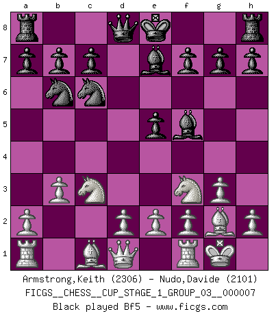 Last move : 1/2-1/2 2025 September 24 2:15:1 [Event "FICGS__CHESS__CUP_STAGE_1_GROUP_03__000007"] [Site "FICGS"] [Date "2025.05.16"] [Round "1"] [White "Armstrong,Keith"] [Black "Nudo,Davide"] [Result "1/2-1/2"] [WhiteElo "2306"] [BlackElo "2101"] 1.c4 e5 2.g3 Nf6 3.Bg2 d5 4.cxd5 Nxd5 5.Nf3 Nc6 6.O-O Nb6 7.Nc3 Be7 8.b3 Bf5 9.Bb2 O-O 10.d3 f6 11.Qc1 Qd7 12.Ba3 Rad8 13.Ne4 Bg4 14.Bxe7 Qxe7 15.Nc5 Bc8 16.a3 a5 17.Qc2 f5 18.Rfe1 h6 19.Nh4 Qd6 20.b4 axb4 21.axb4 Nxb4 22.Qb3+ N4d5 23.Rec1 f4 24.Ra7 Qf6 25.Nf3 Rde8 26.Ne4 Qe6 27.Ra5 Kh8 28.Rb5 Bd7 29.Nc5 Qc6 30.Ra5 Bg4 31.Qb2 Qf6 32.Ne4 Qe7 33.Ra7 Bc8 34.Ra5 Qe6 35.Qa3 Kg8 36.Rb1 Qf7 37.Qb2 Qe6 38.Qa2 Kh8 39.Qb3 Qf7 40.Qb2 Bf5 41.Rc1 Qe7 42.Nh4 Bh7 43.Rb5 Qe6 44.Qb3 Re7 45.Nc5 Qf6 46.Nf3 Bf5 47.Nxb7 e4 48.dxe4 Rxe4 49.Bf1 Re7 50.Nc5 Bg4 51.Nd3 Rd8 52.Nde1 Re6 53.Qa3 Rde8 54.Rbc5 Rd6 55.Ra5 Bh5 56.Qb3 Bf7 57.Qa3 Bh5 58.R1c5 Bg4 59.Qc1 Rf8 60.Bg2 Re8 61.Bf1 Bh5 1/2-1/2 Follow this game move after move (download)A bad plan is better than none at all. (Frank Marshall) Gegen einen Schachcomputer zu verlieren ist wie Löcher in den Strümpfen zuhaben. Es ist nicht peinlich, solange man der einzige ist der es weiß. (Anonymous) Aquel que teme a un Peón de Reina aislado, debería de retirarse del Ajedrez. (Siegbert Tarrasch) Les échecs sont plus proches de l'art de l'assassinat que de l'art de la guerre. (Arturo Perez-Reverte) Programming can only do so much before it becomes too much. (Don Groves)