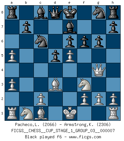 Last move : 1/2-1/2 2025 July 31 1:26:49 [Event "FICGS__CHESS__CUP_STAGE_1_GROUP_03__000007"] [Site "FICGS"] [Date "2025.05.16"] [Round "1"] [White "Pacheco,Leonardo"] [Black "Armstrong,Keith"] [Result "1/2-1/2"] [WhiteElo "2066"] [BlackElo "2306"] 1.e4 c6 2.d4 d5 3.e5 c5 4.dxc5 e6 5.a3 Bxc5 6.b4 Be7 7.Qg4 g6 8.Nf3 a5 9.bxa5 Nc6 10.Bd3 f6 11.Bb2 fxe5 12.Nxe5 Bf6 13.Qe2 Nxe5 14.Bxe5 Bxe5 15.Qxe5 Qf6 16.f4 Rxa5 17.Nd2 Qxe5+ 18.fxe5 Ke7 19.Nf3 Nh6 20.Kd2 Nf7 21.Rhb1 g5 22.Rb4 h5 23.h3 Nd8 24.Nxg5 Nc6 25.Rf1 Nxe5 26.a4 Nc6 27.Rbf4 Bd7 28.Rb1 1/2-1/2 Follow this game move after move (download)There are tough players and nice guys, and I'm a tough player. (Bobby Fischer) Habe Mut, dich deines eigenen Verstandes zu bedienen. (Immanuel Kant) Coloca el contenido de las piezas del Ajedrez en un sombrero, agitalo vigorosamente, arrojalas en un tablero desde una altura de 30 centimetros y así obtendras el estilo de Steinitz. (H. E. Bird) Les échecs, c'est l'imagination. (David Bronstein) Optimism is a variety of information deficit. Sometimes especially true for correspondence chess games. (Michael Aigner)