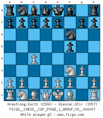 Last move : 1-0 2025 June 22 23:34:22 [Event "FICGS__CHESS__CUP_STAGE_1_GROUP_03__000007"] [Site "FICGS"] [Date "2025.05.16"] [Round "1"] [White "Armstrong,Keith"] [Black "Alencar,Ofir"] [Result "1-0"] [WhiteElo "2306"] [BlackElo "1557"] 1.c4 f5 2.Nf3 Nf6 3.g3 Ne4 4.d3 Nc5 5.b4 Ne6 6.Bb2 Rg8 7.d4 b6 8.d5 Ng5 9.Nxg5 h6 10.Nf3 c6 11.Bg2 cxd5 12.Qxd5 Nc6 13.Qxg8 1-0 Follow this game move after move (download)A win by an unsound combination, however showy, fills me with artistic horror. (Wilhelm Steinitz) Kritik überlasse ich den Spießern. Ich zeige nichts, wofür ich mich schämen muss. (Alexandra Kosteniuk) El Peón aislado arroja penumbra sobre todo el tablero. (Aaron Nimzovich) Toute estimation doit être constamment réévaluée. (Jacob Estrin) My poor ole parrot... Is not in the circulation of displays ....poo hoo hoo :) (Wayne Lowrance's enigma)