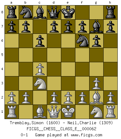 Last move : 0-1 2007 November 19 19:26:57 [Event "FICGS__CHESS__CLASS_E__000062"] [Site "FICGS"] [Date "2007.10.01"] [Round "1"] [White "Tremblay,Simon"] [Black "Neil,Charlie"] [Result "0-1"] [WhiteElo "1600"] [BlackElo "1309"] 1.c4 Nf6 2.g3 g6 3.Bg2 Bg7 4.Nc3 c6 0-1 This chess game has been lost on time (started : 2007.10.01 12:2:13) English, 1...Nf6 (Anglo-Indian defense) Player Black won this chess game. Follow this game move after move (download)Look at Garry Kasparov. After he loses, invariably he wins the next game. He just kills the next guy. That's something that we have to learn to be able to do. (Maurice Ashley) Du weisst es gibt ein Problem mit Computern und Fernschach, wenn jeder eine Rating von 2450 hat. (John Christen Knudsen) Debemos de asegurarnos de que el Ajedrez no se convierta en un lenguaje muerto, muy interesante, pero tan solo para un grupo muy pequeño. (Sytze Faber) Mais l'homme est une créature légère et illogique : semblable au joueur d'échecs, il n'aime que le processus du but à atteindre, non le but lui-même. (Dostoïevsky) Big Chess is a place for big hallucinations. (Thibault de Vassal)
