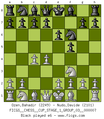 Last move : 1/2-1/2 2025 August 25 11:29:33 [Event "FICGS__CHESS__CUP_STAGE_1_GROUP_03__000007"] [Site "FICGS"] [Date "2025.05.16"] [Round "1"] [White "Ozen,Bahadir"] [Black "Nudo,Davide"] [Result "1/2-1/2"] [WhiteElo "2249"] [BlackElo "2101"] 1.d4 f5 2.Nf3 Nf6 3.c4 e6 4.g3 Be7 5.Bg2 O-O 6.O-O d5 7.Qc2 c6 8.Nbd2 Bd7 9.Ne5 Be8 10.Ndf3 Ne4 11.Nd3 Nd7 12.Be3 g5 13.cxd5 cxd5 14.Rac1 h6 15.Rfd1 Rf7 16.Nfe5 Rg7 17.f3 Nd6 18.Bf2 Bf6 19.Qd2 Nf8 20.Qe1 Rc8 21.Rxc8 Qxc8 22.Rc1 Rc7 23.Rxc7 Qxc7 24.Qd1 b6 25.e3 Nf7 26.Nxf7 Kxf7 27.Bf1 Ng6 28.Kg2 Kg7 29.Ne1 a5 30.Qc2 Qxc2 31.Nxc2 Be7 32.Ne1 Bd6 33.Ba6 Ne7 34.Nd3 Nc6 35.Nc1 Na7 36.Bd3 Kf6 37.g4 fxg4 38.fxg4 a4 39.Bg3 Bxg3 40.Kxg3 e5 1/2-1/2 Follow this game move after move (download)He who fears an isolated Queen's Pawn should give up Chess. (Siegbert Tarrasch) Es tut gut, die Entwicklungsperiode von, [...] demokratischem Geist durchdringen zu lassen. Wie undemokratisch wäre es doch beispielsweise, den einen Offizier große Spaziertouren vornehmen zu lassen, während die anderen zu Hause säßen und sich entsetzlich langweilten. (Aaron Nimzowitsch) El Ajedrez moderno está demasiado preocupado con cosas como la estructura de Peones. Olvidenlo, el Jaque Mate termina la partida. (Nigel Short) Que feriez-vous si vous étiez en train de jouer aux échecs et que la fin du monde arrive ? Je continuerais à jouer. (Saint Borromée) I would love to change the world, but they won't give me the source code. (Unknown)