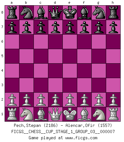 Last move : 1-0 2025 July 14 13:2:37 [Event "FICGS__CHESS__CUP_STAGE_1_GROUP_03__000007"] [Site "FICGS"] [Date "2025.05.16"] [Round "1"] [White "Pech,Stepan"] [Black "Alencar,Ofir"] [Result "1-0"] [WhiteElo "2186"] [BlackElo "1557"] 1.e4 c5 2.Nf3 Nc6 3.d4 Nxd4 4.Nxd4 cxd4 5.Qxd4 Qb6 6.Qxb6 axb6 7.Nc3 e6 8.Nb5 Kd8 9.Bf4 Ra5 10.Bc7+ 1-0 Follow this game move after move (download)Chess, like love, is infectious at any age. (Flohr) Sie bekommen vielleicht den Eindruck, dass die Spitzenspieler überhaupt gar nicht so stark sind. Aber das stimmt nicht. Es ist eine Illusion. Mit einem Computer an der Seite ist es sehr leicht, Urteile zu fällen, aber wenn man alleine am Brett sitzt, sieht die Sache ganz anders aus. (Vladimir Kramnik) Solo existe una cosa que Fischer hace en el Ajedrez sin placer: ¡perder!. (Boris Spassky) Je fais ceci parce que dans cinquante coups j'obtiendrai cela; je m'appelle Mikhail Moisevitch Botvinnik. (Botvinnik) Programming can only do so much before it becomes too much. (Don Groves)