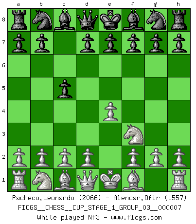 Last move : 1-0 2025 August 2 14:51:38 [Event "FICGS__CHESS__CUP_STAGE_1_GROUP_03__000007"] [Site "FICGS"] [Date "2025.05.16"] [Round "1"] [White "Pacheco,Leonardo"] [Black "Alencar,Ofir"] [Result "1-0"] [WhiteElo "2066"] [BlackElo "1557"] 1.e4 c5 2.Nf3 Nc6 3.Bb5 a6 4.Bxc6 dxc6 5.d3 Bg4 6.Nbd2 Bxf3 7.Qxf3 b6 8.O-O g6 9.a4 b5 10.e5 Rc8 11.axb5 cxb5 12.Rxa6 1-0 This chess game has been lost on time (started : 2025.05.16 14:30:2) Follow this game move after move (download)Even the laziest King flees wildly in the face of a double check ! (Aaron Nimzowitsch) Du musst nicht gut spielen, es reicht, wenn du besser spielst als dein Gegner. (Anonymous) Todos los Maestros de Ajedrez fueron un día unos principiantes. (Chernev) Les Echecs ne sont pas pour les âmes timides. Ils requièrent un homme entier, qui ne s'arrête pas aveuglément à ce qui a été déjà établi, mais qui tente individuellement de sonder les profondeurs du jeu. (W. Steinitz) Every now and then a man's mind is stretched by a new idea and never shrinks back to its former dimensions. (Oliver Wendell Holmes, Sr.)