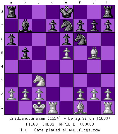 Last move : 1-0 2007 November 9 2:51:53 [Event "FICGS__CHESS__RAPID_B__000069"] [Site "FICGS"] [Date "2007.10.02"] [Round "1"] [White "Cridland,Graham"] [Black "Lemay,Simon"] [Result "1-0"] [WhiteElo "1524"] [BlackElo "1600"] 1.e4 c5 2.Nf3 Nc6 3.d4 cxd4 4.Nxd4 Nf6 5.Nc3 e6 6.Ndb5 a6 7.Nd6+ Bxd6 8.Qxd6 Qe7 9.Qxe7+ Nxe7 10.Bg5 b5 11.O-O-O Bb7 12.e5 1-0 Sicilian defense Queenside Castling by player White (move 11) Player White won this chess game. Follow this game move after move (download)Chess is a part of culture and if a culture is declining then Chess too will decline. (Mikhail Botvinnik) Wenn Du nicht kämpfst, um anderen etwas zu beweisen, sondern nur für Dich selbst, dann bist du fast unbesiegbar. (Garry Kasparov) Alguna parte de un error es siempre correcto. (Savielly Tartakover) La vie est comme un jeu d'échecs : nous esquissons un plan, mais celui-ci est tributaire de ce que daignent faire l'adversaire aux échecs et le destin dans la vie. (Arthur Schopenhauer) The best weapon against an enemy is another enemy. (Friedrich Nietzsche)