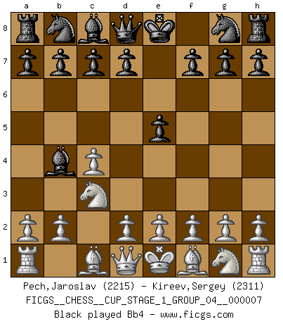 Last move : 1/2-1/2 2025 July 19 16:29:47 [Event "FICGS__CHESS__CUP_STAGE_1_GROUP_04__000007"] [Site "FICGS"] [Date "2025.05.16"] [Round "1"] [White "Pech,Jaroslav"] [Black "Kireev,Sergey"] [Result "1/2-1/2"] [WhiteElo "2215"] [BlackElo "2311"] 1.c4 e5 2.Nc3 Bb4 3.Nd5 Be7 4.d4 exd4 5.Qxd4 Nf6 6.Nxe7 Qxe7 7.Bg5 Nc6 8.Qc3 d6 9.Nf3 Ne5 10.Nxe5 Qxe5 11.Qxe5+ dxe5 12.g3 Ne4 13.Bc1 b6 14.Bg2 Bb7 15.f3 Nd6 16.c5 bxc5 17.b3 c4 18.Kf2 f6 19.Rd1 O-O-O 20.Be3 Kb8 21.Bc5 Rhe8 22.e4 cxb3 23.axb3 Nb5 24.Bf1 Rxd1 25.Rxd1 Bc6 26.Ra1 Rd8 27.g4 Rd2+ 28.Kg3 Rc2 29.b4 Rc3 30.Bxb5 Bxb5 1/2-1/2 Follow this game move after move (download)The game of chess is the touchstone of the intellect. (Goethe) Es war undenkbar für die Behörden, dass ein sowjetischer Großmeister auf diese Art und Weise [Fischer-Taimanov 6:0] verliert, ohne dass es eine politischer Erklärung dafür gäbe. (Mark Taimanov) Realmente no sabemos como el juego fue inventado, aunque hay sospechas. Tan pronto como descubramos a los culpables, se los haremos saber. (Bruce Pandolfini) La vie est comme un jeu d'échecs : nous esquissons un plan, mais celui-ci est tributaire de ce que daignent faire l'adversaire aux échecs et le destin dans la vie. (Arthur Schopenhauer) We need strong personalities and only one world champion to attract sponsors. (Anatoly Karpov)