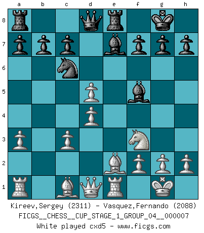 Last move : 1/2-1/2 2025 July 14 3:24:23 [Event "FICGS__CHESS__CUP_STAGE_1_GROUP_04__000007"] [Site "FICGS"] [Date "2025.05.16"] [Round "1"] [White "Kireev,Sergey"] [Black "Vasquez,Fernando"] [Result "1/2-1/2"] [WhiteElo "2311"] [BlackElo "2088"] 1.e4 e5 2.Nf3 Nf6 3.Nxe5 d6 4.Nf3 Nxe4 5.d4 d5 6.Bd3 Nc6 7.O-O Be7 8.c4 Nb4 9.Be2 O-O 10.Nc3 Bf5 11.a3 Nxc3 12.bxc3 Nc6 13.Re1 Re8 14.cxd5 Qxd5 15.Bf4 Rac8 16.Bd3 Qd7 17.Rb1 b6 18.d5 Bxd3 19.Qxd3 Bxa3 20.Ng5 g6 21.Ne4 Qf5 22.Bxc7 Rxc7 23.Nf6+ Qxf6 24.Rxe8+ Kg7 25.dxc6 Bc5 26.Rb2 h5 27.Ra8 a5 28.Qd8 Qxd8 29.Rxd8 Rxc6 30.Kf1 Ba3 31.Rc2 1/2-1/2 Follow this game move after move (download)The tactician knows what to do when there is something to do; whereas the strategian knows what to do when there is nothing to do. (Gerald Abrahams) Wenn Du einsam bist, wenn Du Dich in der Welt wie ein Fremder fühlst, spiele Schach. Das wird Deinen Geist erheben und Dein Ratgeber im Kampf sein. (Aristoteles) Siempre es mucho mejor sacrificar las piezas de tu oponente. (Savielly Tartakover) On peut tirer plus d'utilité d'une partie perdue que de 100 parties gagnées. (Capablanca) Mandala - that's it! 16x16 squares as multiple of the four and the eight because of the Four Noble Truths and the Noble Eightfold Path. (Heinz-Georg Lehnhoff about Big Chess)