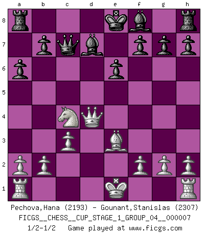 Last move : 1/2-1/2 2025 July 6 0:28:25 [Event "FICGS__CHESS__CUP_STAGE_1_GROUP_04__000007"] [Site "FICGS"] [Date "2025.05.16"] [Round "1"] [White "Pechova,Hana"] [Black "Gounant,Stanislas"] [Result "1/2-1/2"] [WhiteElo "2193"] [BlackElo "2307"] 1.e4 e6 2.d4 d5 3.Nc3 dxe4 4.Nxe4 Nd7 5.Nf3 Ngf6 6.Nxf6+ Nxf6 7.c3 c5 8.Ne5 a6 9.Be3 Qc7 10.Qa4+ Nd7 11.Bb5 cxd4 12.Bxd7+ Bxd7 13.Qxd4 Bc8 14.Nc4 Bd7 1/2-1/2 Follow this game move after move (download)If cunning alone were needed to excel, women would be the best Chess players. (Albin) Ich hatte Angst gegen einen russischen Großmeister zu verlieren, und er befürchtete gegen einen kleinen Jungen zu verlieren. (über ein Remis gegen Juri Awerbach). (Robert James Fischer) Solo existe una cosa que Fischer hace en el Ajedrez sin placer: ¡perder!. (Boris Spassky) Le pion, dans sa simplicité, marche droit devant lui, mais lorsqu'il prend, il le fait obliquement? Ainsi l'homme, tant qu'il reste pauvre, marche dans la droiture et vit honnêtement, mais lorsqu'il recherche les honneurs, il flatte, se parjure et, par les voies obliques, cherche une position supérieure sur l'échiquier du monde. (Jean de Galles) Creativity is allowing yourself to make mistakes. Art is knowing which ones to keep. (Scott Adams)