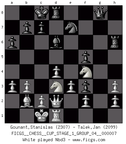 Last move : 1/2-1/2 2025 June 19 0:55:6 [Event "FICGS__CHESS__CUP_STAGE_1_GROUP_04__000007"] [Site "FICGS"] [Date "2025.05.16"] [Round "1"] [White "Gounant,Stanislas"] [Black "Talek,Jan"] [Result "1/2-1/2"] [WhiteElo "2307"] [BlackElo "2099"] 1.b3 e5 2.Bb2 Nc6 3.e3 d5 4.Bb5 Nge7 5.Bxe5 a6 6.Bxc6+ Nxc6 7.Bc3 h5 8.Nf3 Rh6 9.Bb2 g5 10.d4 Bf5 11.Nc3 g4 12.Ne5 Bb4 13.Nd3 Qg5 14.Qd2 h4 15.Nf4 Be4 16.Rg1 h3 17.gxh3 Bf3 18.Rg3 f5 19.a3 Bd6 20.Ncxd5 O-O-O 21.Rxf3 gxf3 22.O-O-O Ne7 23.Nb4 Qg8 24.Nbd3 Nd5 25.Nxd5 Qxd5 26.e4 fxe4 27.Qxh6 exd3 28.Qe3 dxc2 29.Rd3 Rf8 30.Kxc2 Bxh2 31.a4 Bd6 32.Bc1 1/2-1/2 Follow this game move after move (download)Don't even mention losing to me. I can't stand to think of it. (Bobby Fischer) Es ist peinlich, dass ich nie Weltmeister wurde. Es wäre leicht, Leonid Breschnjew als Ursache vorzuschieben, dessen Apparat den Vorzeigekommunisten Anatoli Karpow in allem unterstützte. Aber Garri Kasparow zum Beispiel, der ebenfalls von den Sowjets unerwünscht war, hat trotz der Widerstände den WM-Titel erobert. (Viktor Kortschnoi) El juego de Fischer siempre fue nítido, racional y brillante. Uno de los mejores por siempre. (Dave Regis) Les Echecs représentent une sphère d'idées créatrices basée sur la volonté des deux protagonistes. (Smyslov) Luck never gives; it only lends. (Swedish proverb)
