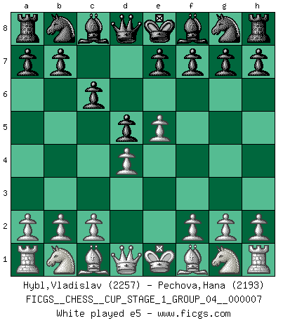 Last move : 1-0 2025 October 11 0:55:47 [Event "FICGS__CHESS__CUP_STAGE_1_GROUP_04__000007"] [Site "FICGS"] [Date "2025.05.16"] [Round "1"] [White "Hybl,Vladislav"] [Black "Pechova,Hana"] [Result "1-0"] [WhiteElo "2257"] [BlackElo "2193"] 1.e4 c6 2.d4 d5 3.e5 Bf5 4.Nf3 e6 5.Be2 Ne7 6.O-O c5 7.c4 Nbc6 8.dxc5 d4 9.Qb3 Qc7 10.Na3 a6 11.Qa4 Rd8 12.b4 Ng6 13.Bd1 Rd7 14.Nc2 Bxc2 15.Bxc2 d3 16.Bd1 Be7 17.Bb2 O-O 18.g3 Rfd8 19.Re1 d2 20.Re3 f6 21.exf6 Bxf6 22.Qb3 a5 23.a3 Nd4 24.Nxd4 Bxd4 25.Bxd4 Rxd4 26.Qc2 Ne5 27.Be2 axb4 28.axb4 Nxc4 29.Rxe6 b5 30.cxb6 Qc8 31.Re4 Rxe4 32.Qxe4 Nxb6 33.Bd1 Nd5 34.Ra7 h6 35.Qg6 Qc3 36.b5 Qe5 37.Kg2 Qf6 38.Qxf6 Nxf6 39.b6 Rb8 40.b7 Kf7 41.Kf3 Nd5 42.Bb3 Ke7 43.Ke2 d1Q+ 44.Kxd1 Nc3+ 45.Kd2 1-0 This chess game has been lost on time (started : 2025.05.16 14:30:3) Follow this game move after move (download)A great player and a great example for many. His book My 60 Memorable Games had a big impact on me. It is a shame he didn't continue to enrich the world of chess with his unparalleled understanding after 1972. (Jan Timman, about Bobby Fischer's death) Nach Morphy wurde nichts neues mehr in der Behandlung offener Positionen gefunden. (Mikhail Moiseyevich Botvinik) El Ajedrez es un expediente tonto que hace creer a la gente inactiva que hacen una cosa muy astuta cuando solamente estan perdiendo su tiempo. (George Bernard Shaw) Nous sommes les pions de la mystérieuse partie d'Echecs jouée par Dieu. Il nous déplace, nous arrête, nous pousse encore, puis nous lance un à un dans la boîte du Néant. Epitaphe sur la tombe de David Janowsky (1868-1927). Computers are like Old Testament gods; lots of rules and no mercy. (Joseph Campbell)