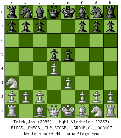 Last move : 0-1 2025 August 26 23:36:56 [Event "FICGS__CHESS__CUP_STAGE_1_GROUP_04__000007"] [Site "FICGS"] [Date "2025.05.16"] [Round "1"] [White "Talek,Jan"] [Black "Hybl,Vladislav"] [Result "0-1"] [WhiteElo "2099"] [BlackElo "2257"] 1.Na3 e5 2.e3 d5 3.d4 Nc6 4.dxe5 Nxe5 5.Bd2 Nf6 6.Bc3 Ng6 7.Nb1 Bd6 8.Nf3 O-O 9.Be2 b6 10.a4 Bb7 11.O-O Ne4 12.Qd4 f6 13.a5 c5 14.Qd1 Qd7 15.axb6 axb6 16.Rxa8 Rxa8 17.Bd3 Bc6 18.h3 h6 19.Be1 f5 20.Nc3 Nf6 21.Nb1 Bc7 22.Na3 Kh8 23.c3 Re8 24.Bd2 Ne4 25.Re1 Re6 26.Kf1 Rf6 27.Bb1 Qd6 28.Bd3 Ne7 29.Nb5 Bxb5 30.Bxb5 g5 31.Bc1 c4 32.Nd2 Qh2 33.Qh5 Nxf2 34.Kxf2 Bg3+ 35.Ke2 Qxg2+ 36.Kd1 Bxe1 37.Nxc4 Qh1 38.Nd2 Bxd2 39.Kxd2 Kg7 40.Qe8 Qg2+ 41.Be2 Ng6 42.Kd1 Qh1+ 43.Kd2 Qe4 44.Qd8 Ne5 0-1 Follow this game move after move (download)By the beauty of his games, the clarity of his play, and the brilliance of his ideas, Fischer made himself an artist of the same stature as Brahms, Rembrandt, and Shakespeare. (David Levy) Wer mein Gambit spielt, muß bereit sein, alle Brücken hinter sich abzubrechen. Es verändert den ganzen Menschen. Es wirkt wie ein Zauberstab und fördert verkümmerte, gute Charakter- eigenschaften wieder zu Tage. (Emil Joseph Diemer) Yo siempre he tenido un ligero sentimiento de lástima por una persona que no tiene conocimiento del Ajedrez. (Siegbert Tarrasch) Je crois qu'il existe des manières très spécifiques de jouer efficacement contre une machine. Evidemment, nous n'avons aucune chance en technique pure, parce que l'ordinateur calcule de manière parfaite. Mais lorsque nous faisons appel à notre cerveau, en utilisant l'intuition et la compréhension, alors nous restons beaucoup plus forts. (Anatoli Karpov) Success without honor is an unseasoned dish; it will satisfy your hunger, but it won't taste good. (Joe Paterno)