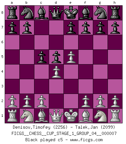 Last move : 1/2-1/2 2025 September 14 23:33:26 [Event "FICGS__CHESS__CUP_STAGE_1_GROUP_04__000007"] [Site "FICGS"] [Date "2025.05.16"] [Round "1"] [White "Denisov,Timofey"] [Black "Talek,Jan"] [Result "1/2-1/2"] [WhiteElo "2256"] [BlackElo "2099"] 1.e4 c6 2.d4 d5 3.e5 c5 4.Nf3 cxd4 5.Nxd4 Nc6 6.Nxc6 bxc6 7.Bd3 e6 8.O-O Ne7 9.Nd2 a5 10.Nf3 Ba6 11.Bxa6 Rxa6 12.c4 Ng6 13.cxd5 cxd5 14.Be3 Be7 15.Qe2 Ra8 16.g3 O-O 17.h4 Qb8 18.Bd4 Rc8 19.h5 Nf8 20.Rfc1 Qb7 21.Qd2 Bb4 22.Qe3 h6 23.a3 Be7 24.Rc3 Nh7 25.Rac1 a4 26.Nd2 Nf8 27.Nf3 Nd7 28.Qd3 Rxc3 29.Qxc3 Bd8 30.Qc6 Qxc6 31.Rxc6 Kf8 32.Ne1 Nb8 33.Rc1 Ke8 34.Nd3 Nd7 35.Rc6 Nb8 36.Rc2 Nd7 37.Rc6 Nb8 38.Rc1 Nd7 39.Kf1 Nb6 40.Bxb6 Bxb6 41.Rc6 Bd4 42.f4 Kd7 43.Rd6+ Ke7 44.Rc6 Kd7 45.Rd6+ Ke7 46.Ke1 f6 47.Rc6 Kd7 48.Rd6+ Ke7 49.Rc6 Kd7 50.Rd6+ 1/2-1/2 Follow this game move after move (download)I like the moment when I break a man's ego. (Bobby Fischer) Ich würde mich als ganz normalen Jungen bezeichnen [Im Alter von 12]. (Sergej Karjakin) Cuando tengas duda... ¡juega al Ajedrez!. (Tevis) Tous ces prétendus hommes politiques sont les pions, les Cavaliers, les Tours ou les Fous d'une partie d'échecs qui se jouera tant qu'un hasard ne renversera pas l'échiquier. (Honoré de Balzac) Never risk one's whole fortune unless supported by one's entire army. (Niccolo Machiavelli)