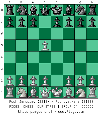 Last move : 0-1 2025 August 28 3:11:45 [Event "FICGS__CHESS__CUP_STAGE_1_GROUP_04__000007"] [Site "FICGS"] [Date "2025.05.16"] [Round "1"] [White "Pech,Jaroslav"] [Black "Pechova,Hana"] [Result "0-1"] [WhiteElo "2215"] [BlackElo "2193"] 1.e4 d5 2.exd5 Nf6 3.d4 Nxd5 4.Nf3 g6 5.c4 Nb6 6.Nc3 Bg7 7.h3 O-O 8.Be3 Nc6 9.Qd2 e5 10.d5 Nd4 11.Nxd4 exd4 12.Bxd4 Re8+ 13.Be3 Bd7 14.Be2 Qh4 15.g3 Qe7 16.Rc1 Be5 17.h4 c6 18.h5 cxd5 19.hxg6 fxg6 20.cxd5 Rac8 21.Bxb6 axb6 0-1 Follow this game move after move (download)Every Chess master was once a beginner. (Chernev) Kostenjuk hat keinen Sexappeal. (Loek van Wely) Bobby Fischer es el jugador de Ajedrez mas grande que jamás haya existido. (Ken Smith) Le thème de l'attaque double intervient d'une manière ou d'une autre dans l'immense majorité des combinaisons. (Youri Averbakh) If I had no sense of humor, I would long ago have committed suicide. (Mahatma Gandhi)