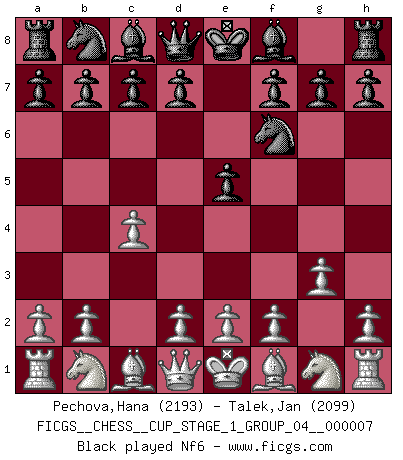 Last move : 0-1 2025 July 25 23:52:32 [Event "FICGS__CHESS__CUP_STAGE_1_GROUP_04__000007"] [Site "FICGS"] [Date "2025.05.16"] [Round "1"] [White "Pechova,Hana"] [Black "Talek,Jan"] [Result "0-1"] [WhiteElo "2193"] [BlackElo "2099"] 1.c4 e5 2.g3 Nf6 3.Bg2 h6 4.Nc3 Bb4 5.e4 d6 6.Nge2 Nc6 7.O-O Bc5 8.h3 a5 9.Nb5 Bd7 10.d3 O-O 11.Kh2 Na7 12.Nxa7 Bxa7 13.a4 c6 14.Bd2 Bc5 15.f4 Re8 16.Rc1 Qb6 17.Rb1 Be3 18.Bc3 Qd8 19.Qc2 b5 20.Rbd1 b4 0-1 This chess game has been lost on time (started : 2025.05.16 14:30:3) Follow this game move after move (download)Chess is the art of analysis. (Mikhail Botvinnik) Nicht daß Diemer aus Opportunismus Mitglied der NSDAP geworden wäre. Er war ein Fanatiker, in allem, was er tat. (Hans Ree) El Ajedrez es en su esencia, un juego. En su forma, un arte. Y en su ejecución, una ciencia. (Baron Tassilo) Karpov est une pièce de musée. (Garry Kasparov) Games, world of games... There's always an opponent, and there's always a victim. (Revolver, movie)