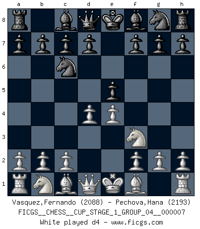 Last move : 1-0 2025 October 11 0:55:47 [Event "FICGS__CHESS__CUP_STAGE_1_GROUP_04__000007"] [Site "FICGS"] [Date "2025.05.16"] [Round "1"] [White "Vasquez,Fernando"] [Black "Pechova,Hana"] [Result "1-0"] [WhiteElo "2088"] [BlackElo "2193"] 1.e4 e5 2.Nf3 Nc6 3.d4 exd4 4.Nxd4 Bc5 5.Be3 Qf6 6.c3 Nge7 7.Bc4 Ne5 8.Be2 Qg6 9.O-O d6 10.f3 O-O 11.Nd2 d5 12.Kh1 dxe4 13.Nxe4 Bb6 14.a4 a5 15.Re1 Bf5 16.Nxf5 Nxf5 17.Bxb6 Qxb6 18.Qd2 Rfe8 19.Bb5 c6 20.Bf1 Ng6 21.Qg5 Nfe7 22.Qc5 Qc7 23.Qd6 Qc8 24.Rad1 Rd8 25.Qxd8+ Qxd8 26.Rxd8+ Rxd8 27.g3 Kf8 28.f4 Nf5 29.Kg2 Nd6 30.Nc5 b6 31.Nb3 Ne7 32.Kf3 g6 33.Bd3 Nb7 34.Nd4 Rd6 35.Rd1 f5 36.h3 h5 37.Bc2 Nc5 38.Kf2 Ke8 39.Re1 Kd7 40.Nf3 Nd5 41.Ne5+ Kc7 42.Nc4 Rf6 43.Ne5 Re6 44.Kf3 Ne7 45.Ra1 Rd6 46.Nc4 1-0 This chess game has been lost on time (started : 2025.05.16 14:30:3) Follow this game move after move (download)All I want to do, ever, is just play Chess. (Bobby Fischer) Ich tröste mich mit dem Vergnügen, daß Schachfans, Zuschauer und Leser glücklich sind, wenn ein Großmeister etwas riskiert, statt nur Klötzchen zu schieben. (Mikhail Nekhemyevich Tal) Un jugador que trata de regresar una movida en el Ajedrez es un futuro carterista. (Richard Fenton) Les échecs sont un jeu par leur forme, un art par leur essence et une science par sa difficulté d'acquisition. Ils peuvent vous procurer autant de plaisir qu'un bon livre ou une belle musique, mais vous n'aurez une réelle joie que si vous arrivez à bien jouer. (Tigran Petrosian) I take risks, sometimes patients die, but not taking risks causes more patients to die. So I guess my biggest problem is I've been cursed with the ability to do the math. (Gregory House, House M.D.)