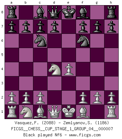 Last move : 1-0 2025 July 10 18:3:59 [Event "FICGS__CHESS__CUP_STAGE_1_GROUP_04__000007"] [Site "FICGS"] [Date "2025.05.16"] [Round "1"] [White "Vasquez,Fernando"] [Black "Zemlyanov,Sergey"] [Result "1-0"] [WhiteElo "2088"] [BlackElo "1186"] 1.e4 e5 2.Nf3 Nc6 3.d4 exd4 4.Nxd4 Nf6 5.Nc3 Bb4 6.Nxc6 1-0 This chess game has been lost on time (started : 2025.05.16 14:30:3) Follow this game move after move (download)The battle for the ultimate truth will never be won. And that's why Chess is so fascinating. (Hans Kmoch) Ich spiele 70 Eröffnungssysteme. (Viktor Kortschnoi) Robert Fischer es la ley hacia si mismo. (Larry Evans) Même si l'adversaire joue le coup analysé précédemment, recommencez l'analyse en voyant la nouvelle position. Première règle de Blumenfeld Somewhere in the world there is an epigram for every dilemma. (Hendrik Willem van Loon)