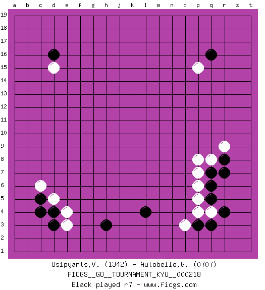 Last move : 1-0 2025 August 29 21:33:15 [Event "FICGS__GO__TOURNAMENT_KYU__000218"] [Site "FICGS"] [Date "2025.05.19"] [Round "1"] [Black "Osipyants,Vladimir"] [White "Autobello,Giovanni"] [Result "1-0"] [Rating 1 "1342"] [Rating 2 "0707"] 1.q16 p15 2.d16 d15 3.d4 d5 4.q3 q4 5.r4 p5 6.q5 p4 7.p3 o3 8.q6 p6 9.q7 p7 10.l4 p8 11.h3 e4 12.d3 e3 13.c5 c6 14.c4 q8 15.r8 r9 16.r7 p2 17.q2 q1 18.o2 p1 19.r1 d2 20.c2 c1 21.e2 d1 22.b1 e1 23.f1 o1 24.n1 n2 25.n3 n4 26.o4 m2 27.m3 l3 28.m4 n5 29.q15 p16 30.q17 p17 31.r13 q13 32.r12 q12 33.f15 f2 34.f3 g2 35.g3 j3 36.j4 k4 37.k5 k3 38.h5 m1 39.h2 g1 40.h1 o1 41.d10 e14 42.c16 c15 43.d12 r10 44.c8 d8 45.c7 d7 46.e5 d6 47.b6 f5 48.f4 e6 49.d9 e9 50.e10 f10 51.f9 f8 52.e8 g9 53.e9 e7 54.f7 g8 55.f6 g5 56.g6 j6 57.j5 h7 58.j16 e16 59.e17 f17 60.f16 e15 61.d17 1-0 This go game has been lost on time (started : 2025.05.19 16:4:41) Follow this game move after move (download)The nature of a game comes from what is played, but it's the sensitivity to the possible and the impossible that gives it value. (Pierre Audouard) A good player is always lucky. (Capablanca)