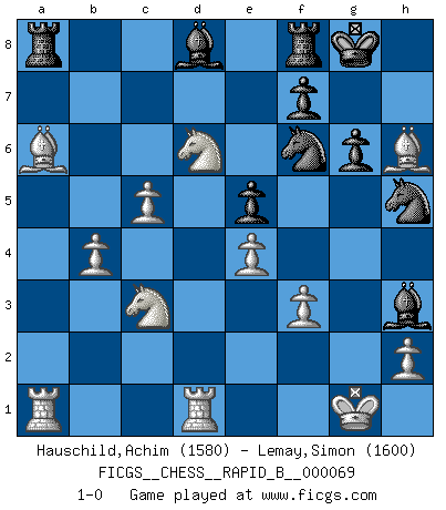 Last move : 1-0 2007 November 9 2:54:29 [Event "FICGS__CHESS__RAPID_B__000069"] [Site "FICGS"] [Date "2007.10.02"] [Round "1"] [White "Hauschild,Achim"] [Black "Lemay,Simon"] [Result "1-0"] [WhiteElo "1580"] [BlackElo "1600"] 1.d4 Nf6 2.c4 e6 3.f3 b6 4.e4 d6 5.Bd3 Bb7 6.Ne2 Nbd7 7.O-O Be7 8.Be3 O-O 9.Nbc3 c5 10.a4 cxd4 11.Nxd4 Nc5 12.Be2 a6 13.Qe1 g6 14.b4 Ncd7 15.a5 bxa5 16.Rxa5 Qc8 17.Qg3 Bd8 18.R5a1 e5 19.Nf5 Nh5 20.Qh3 Ndf6 21.Nxd6 Qxh3 22.gxh3 Bc6 23.c5 Bd7 24.Bxa6 Bxh3 25.Rfd1 h6 26.Bxh6 1-0 Queen's pawn game Kingside Castling by player White (move 7) Kingside Castling by player Black (move 8) Player White won this chess game. Follow this game move after move (download)A man that will take back a move at Chess will pick a pocket. (Richard Fenton) Die Leute spielen gegen mich seit 15 Jahren unter Ihren Möglichkeiten. (Robert James Fischer) Si no le temes a Spassky, entonces elimino el elemento del dinero. (Jim Slater) Vous m'avez demandé de vous exposer quel est le fondement de la prière. Je ne fais que préparer les pièces du jeu sur la table... Nous sera-t-il permis d'en adopter les règles et si nous les appliquons scrupuleusement nous ne tarderons pas à faire mat le Roi divin ! Il ne pourra échapper à nos mains. (Sainte Thérèse d'Avila, Chemin de perfection) Statistics can be made to prove anything - even the truth. (Author unknown)