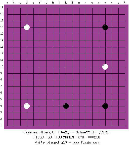 Last move : 0-1 2025 July 12 15:53:38 [Event "FICGS__GO__TOURNAMENT_KYU__000218"] [Site "FICGS"] [Date "2025.05.19"] [Round "1"] [Black "Jimenez Alban,Xavier Miguel"] [White "Schuett,Wilhelm"] [Result "0-1"] [Rating 1 "0421"] [Rating 2 "1372"] 1.q16 d4 2.q4 d16 3.k4 q10 4.q7 k16 5.e3 d3 6.d2 e4 7.f3 d10 8.q12 r8 9.q8 r9 0-1 This go game has been lost on time (started : 2025.05.19 16:4:41) Follow this game move after move (download)... {it is} something unearthly... if there are sentient beings on other planets, then they play go. (Emanuel Lasker, chess world champion) Perseverance does not equal worthiness. Next time you want to get my attention, wear something fun. Low-riding jeans are hot. (Gregory House, House M.D.)