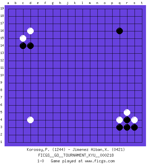 Last move : 1-0 2025 June 27 23:48:39 [Event "FICGS__GO__TOURNAMENT_KYU__000218"] [Site "FICGS"] [Date "2025.05.19"] [Round "1"] [Black "Korossy,Peter"] [White "Jimenez Alban,Xavier Miguel"] [Result "1-0"] [Rating 1 "1244"] [Rating 2 "0421"] 1.q16 d4 2.q3 d16 3.c14 c15 4.d14 r5 5.r4 s4 6.s3 q4 7.r3 1-0 Follow this game move after move (download)Avoid the plate connection. (Anonymous) No man has ever achieved immortality in his own life time. (Unknown)