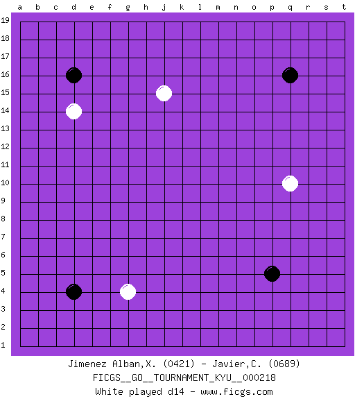 Last move : 0-1 2025 July 4 12:13:39 [Event "FICGS__GO__TOURNAMENT_KYU__000218"] [Site "FICGS"] [Date "2025.05.19"] [Round "1"] [Black "Jimenez Alban,Xavier Miguel"] [White "Javier,Christian"] [Result "0-1"] [Rating 1 "0421"] [Rating 2 "0689"] 1.q16 j15 2.p5 g4 3.d16 q10 4.d4 d14 5.c17 c15 6.c16 d15 0-1 This go game has been lost on time (started : 2025.05.19 16:4:41) Follow this game move after move (download)The strong player plays straight, the weak diagonally. (Anonymous) Go and wake up your luck. (Persian saying)
