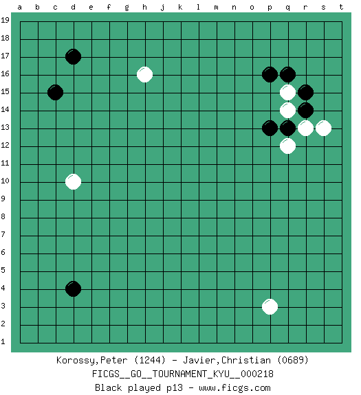 Last move : g11 2026 February 4 20:30:12 Player 1 - 94 days 22:27:49 Player 2 - 9 days 18:41:47 [Event "FICGS__GO__TOURNAMENT_KYU__000218"] [Site "FICGS"] [Date "2025.05.19"] [Round "1"] [Black "Korossy,Peter"] [White "Javier,Christian"] [Result "*"] [Rating 1 "1244"] [Rating 2 "0689"] 1.q16 h16 2.d4 p3 3.d17 d10 4.c15 s13 5.r14 q15 6.r15 q14 7.p16 r13 8.q13 q12 9.p13 p14 10.o14 p12 11.o13 r12 12.q4 s14 13.s15 s16 14.t15 t14 15.r9 o12 16.l16 r16 17.p15 n12 18.n3 t16 19.q17 n13 20.p9 n14 21.c12 n15 22.n17 q18 23.r17 s17 24.s18 t18 25.l13 r18 26.s19 r19 27.t17 p17 28.o17 n16 29.m11 m16 30.m17 s16 31.s11 s17 32.t16 t19 33.p18 p19 34.o19 s18 35.g14 l15 36.k16 k15 37.j14 j16 38.j15 k17 39.l17 l18 40.k18 j17 41.m18 l19 42.j18 n19 43.m19 o18 44.p17 g17 45.f18 h18 46.f16 j19 47.k19 g19 48.f17 l11 49.m12 n11 50.m10 m9 51.n10 k13 52.k14 l12 53.m13 l10 54.o10 j13 55.g15 h13 56.g10 f9 57.f11 n9 58.l9 o8 59.k9 l8 60.k8 o11 61.q10 p8 62.q8 g13 63.f13 f12 64.g12 h11 65.h10 o9 66.e12 q7 67.r7 o7 68.q6 p6 69.q5 h15 70.h14 p11 71.p10 k7 72.l7 m8 73.l6 s9 74.s10 j8 75.j9 j10 76.k10 j11 77.h9 k11 78.c6 h8 79.g8 s12 80.t12 t10 81.s8 r11 82.r10 f14 83.e14 n7 84.n5 m7 85.m5 e17 86.e18 g7 87.h6 q14 88.g16 c13 89.c9 j12 90.f3 l5 91.k6 j6 92.h7 f8 93.j7 g6 94.e7 e10 95.f7 f6 96.e6 e5 97.g5 e8 98.c7 c10 99.d12 c11 100.b12 b11 101.b9 b10 102.f5 d8 103.d9 m14 104.r3 s7 105.s6 m4 106.n4 d16 107.c16 k5 108.j5 j4 109.l3 h4 110.p5 o5 111.h2 d14 112.b13 t8 113.t7 c17 114.e16 g6 115.pass m2 116.n2 k3 117.m6 d5 118.c5 b14 119.c14 j2 120.g2 c8 121.b8 e4 122.e3 g3 123.g4 o15 124.h17 b6 125.b7 q15 126.p14 j16 127.l14 b16 128.b17 k17 129.pass h16 130.j17 l19 131.o4 b5 132.b3 f10 133.b4 b15 134.c18 e15 135.e13 l4 136.o6 a9 137.a8 a10 138.a12 d19 139.d15 q15 140.t11 b18 141.a17 c19 142.e19 d18 143.b19 c19 144.d19 r6 145.r5 d3 146.c4 e11 147.g11 * Follow this game move after move (download)If you lose by one point, take a rest. (Anonymous) Art is the triumph over chaos. (John Cheever)
