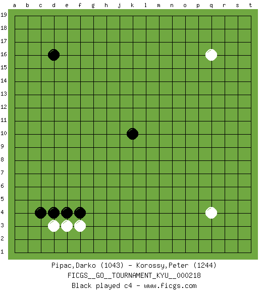 Last move : 0-1 2025 July 16 17:5:38 [Event "FICGS__GO__TOURNAMENT_KYU__000218"] [Site "FICGS"] [Date "2025.05.19"] [Round "1"] [Black "Pipac,Darko"] [White "Korossy,Peter"] [Result "0-1"] [Rating 1 "1043"] [Rating 2 "1244"] 1.d4 q4 2.d16 q16 3.k10 f3 4.f4 e3 5.e4 d3 6.c4 c3 7.g4 d10 8.e10 d9 9.e9 c7 10.d7 c6 11.d6 c14 12.d14 c15 13.d15 c16 14.d17 j16 15.j15 g16 16.g15 k16 0-1 This go game has been lost on time (started : 2025.05.19 16:4:41) Follow this game move after move (download)If your stone is capped, play the knight's move. (Anonymous) I've lost money so fast in these clubs it's left me reeling. I've read every poker book ever written, but the only way to get better at the game is to go out and play with people who are really good. The problem is, you stand to lose a lot of money doing it. (Matt Damon)