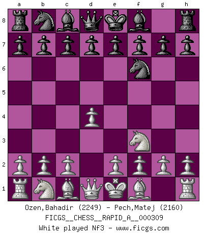 Last move : 1/2-1/2 2025 August 25 23:36:56 [Event "FICGS__CHESS__RAPID_A__000309"] [Site "FICGS"] [Date "2025.05.25"] [Round "1"] [White "Ozen,Bahadir"] [Black "Pech,Matej"] [Result "1/2-1/2"] [WhiteElo "2249"] [BlackElo "2160"] 1.d4 Nf6 2.Nf3 g6 3.g3 Bg7 4.Bg2 O-O 5.O-O d5 6.c4 c6 7.cxd5 cxd5 8.Nc3 Nc6 9.Ne5 Bf5 10.Nxc6 bxc6 11.Bf4 Nd7 12.Qd2 Re8 13.Rac1 e5 14.dxe5 Nxe5 15.b3 h5 16.h3 Qd7 17.Kh2 Qe7 18.Bg5 Qb4 19.e4 dxe4 20.Nxe4 Qxd2 21.Nxd2 Rac8 22.Ne4 Nd3 23.Nd6 Nxc1 24.Nxc8 Bxc8 25.Rxc1 Bd4 26.Rxc6 Bxf2 27.Bd5 Bb6 28.Bc4 Kh7 29.a4 1/2-1/2 Follow this game move after move (download)Bobby is the most misunderstood, misquoted celebrity walking the face of this earth. (Yasser Seirawan) Sicherlich können nur Meister einen Stil haben. Daß ein nicht-Meister auch nur ein einziges Mal in seinem Leben eine Partie folgerecht durchführte, habe ich niemals bemerkt. (Emanuel Lasker) Un entendimiento minucioso de las típicas continuaciones de mate hacen de las mas complicadas combinaciones de sacrificio que conducen hacia ellas no solo no dificiles, sino casi un asunto de rutina. (Siegbert Tarrasch) On est toujours la mazette de quelqu'un d'autre. (Anonyme) Luck is when opportunity knocks and you answer. (Anonymous)