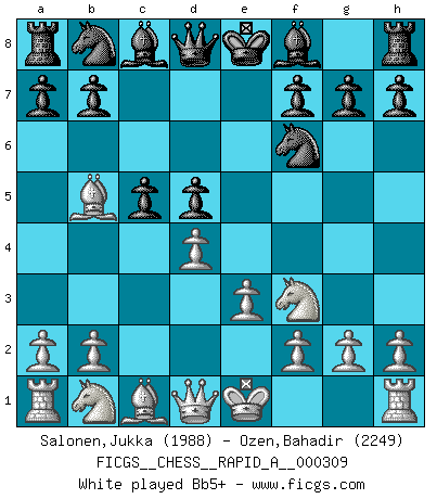 Last move : 0-1 2025 November 26 13:44:49 [Event "FICGS__CHESS__RAPID_A__000309"] [Site "FICGS"] [Date "2025.05.25"] [Round "1"] [White "Salonen,Jukka"] [Black "Ozen,Bahadir"] [Result "0-1"] [WhiteElo "1988"] [BlackElo "2249"] 1.d4 Nf6 2.c4 e6 3.Nf3 d5 4.e3 c5 5.cxd5 exd5 6.Bb5+ Nbd7 7.O-O c4 8.Nc3 a6 9.Bxd7+ Bxd7 10.Ne5 Be7 11.e4 Be6 12.exd5 Nxd5 13.f4 O-O 14.f5 f6 15.Nc6 bxc6 16.fxe6 Qb6 17.Na4 Qb5 18.Nc3 Qb6 19.Na4 Qa7 20.b3 cxb3 21.axb3 Rae8 22.Qd3 Nb4 23.Qh3 Nc2 24.Ra2 Nxd4 25.Be3 Rd8 26.Rf4 g5 27.Rxd4 Rxd4 28.Rd2 c5 29.Bxd4 cxd4 30.Qd3 Qb7 31.h4 gxh4 32.Qxd4 Qxb3 33.Rd3 Qb1+ 34.Rd1 Qc2 35.Nc3 Kh8 36.Qd3 Qb3 37.Nd5 Qxd3 38.Rxd3 Rd8 39.Kf1 Rd6 40.Ke2 Rxe6+ 41.Kf3 a5 42.Rd4 Rd6 43.Ke4 Bd8 44.Rc4 Kg8 45.Kd4 Bb6+ 46.Ke4 Kf7 47.Ra4 Bd8 48.Ra2 Re6+ 49.Kd4 f5 50.Kc5 Be7+ 51.Kb5 Re5 52.Kc6 Bb4 53.Nf4 Kf6 54.Ne2 Rc5+ 55.Kb6 Rd5 56.Ng1 Rd2 57.Ra1 Rxg2 58.Kc6 Kg5 59.Rf1 Rc2+ 60.Kd5 Kg4 61.Nf3 h3 0-1 This chess game has been lost on time (started : 2025.05.25 23:28:30) Follow this game move after move (download)Before the endgame, the Gods have placed the middle game. (Siegbert Tarrasch) Ich spiele 70 Eröffnungssysteme. (Viktor Kortschnoi) Robert Fischer es la ley hacia si mismo. (Larry Evans) Les pièces de l'échiquier étaient impitoyables. Elles le retenaient, elles l'absorbaient. Il y avait de l'horreur en cela, mais aussi une harmonie unique. Car, qu'y a-t-il dans le monde, à part les échecs ? (V. Nabokov) Kids, you tried your best and you failed miserably. The lesson is, never try. (Simpsons)